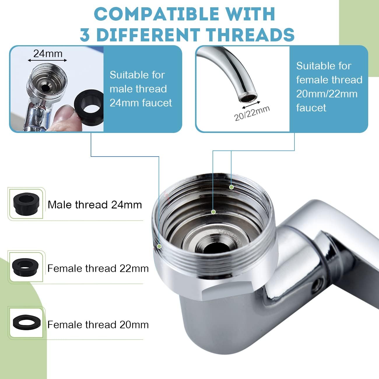 Universal compatibility - with adapters for 24 mm male and 22 mm/20 mm female threads - means an easy win for any sink. The 360° swivel head lets you aim water to the center of the sink, and the anti-splash aerator keeps counters dry.
